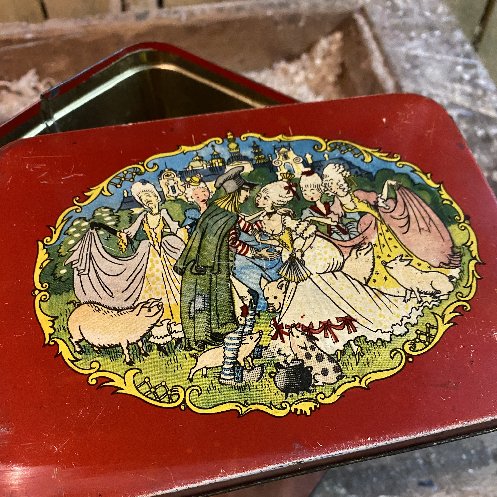 Gammel rød metaldåse med motiv