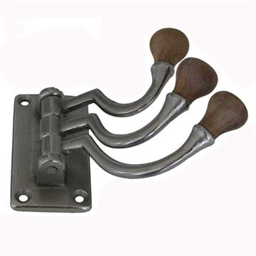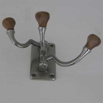 De tre kroge er fastgjort til jernpladen og kan pege i tre forskellige retninger, hvilket gør det muligt at hænge flere jakker m.m. fra en krog.