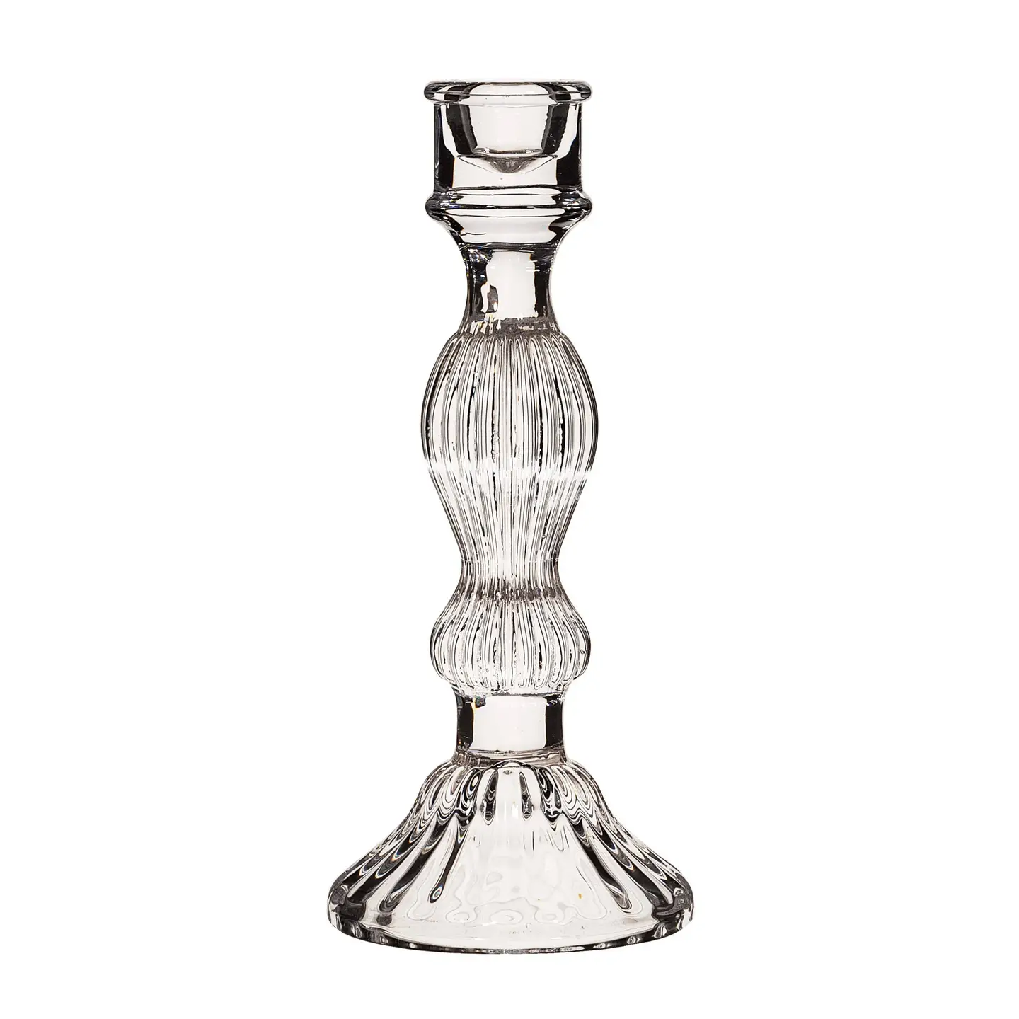 Denne vintage lysestage i klart glas tilfører elegance til enhver indretning. Med sit tidløse design er den perfekt til at skabe en stemningsfuld atmosfære i dit hjem.