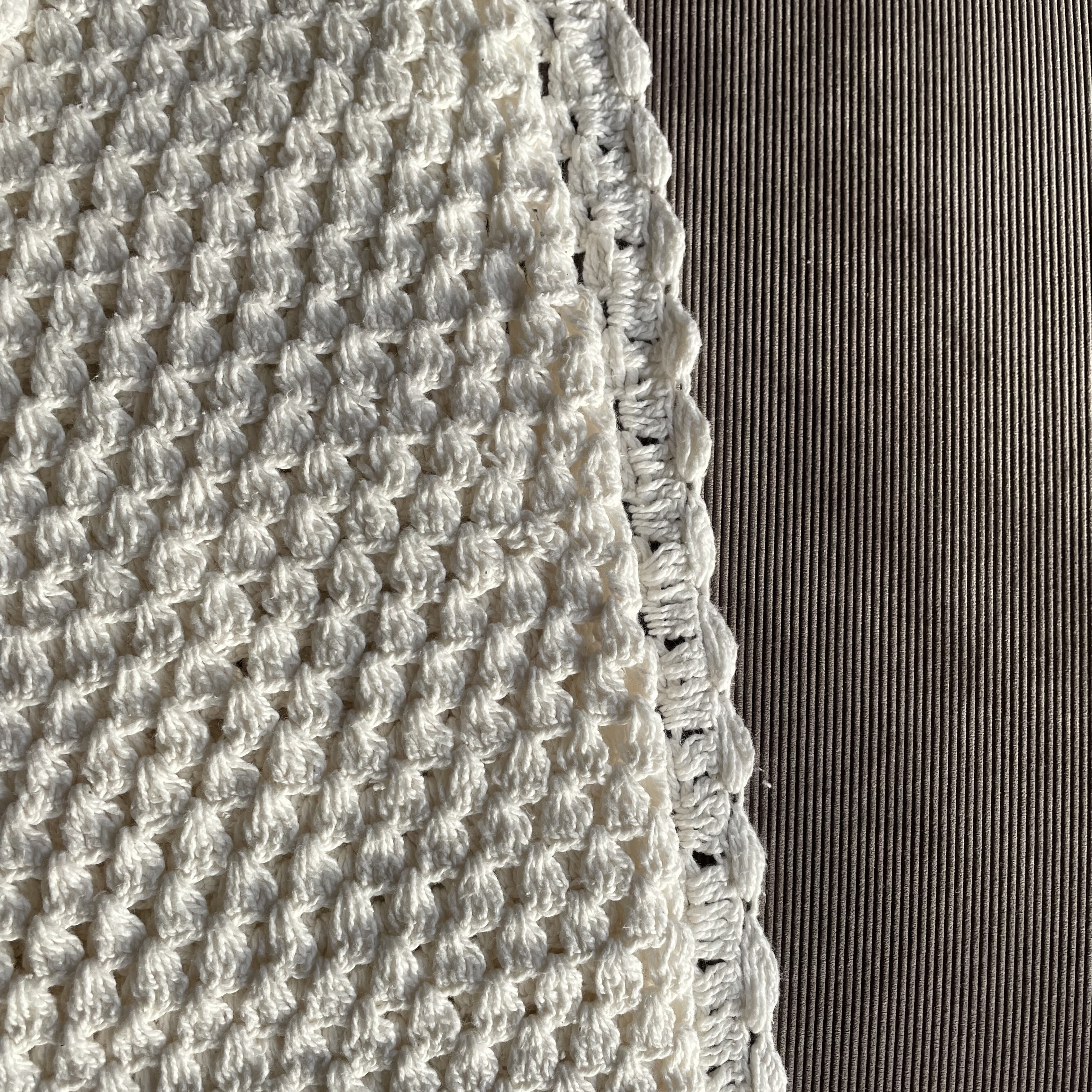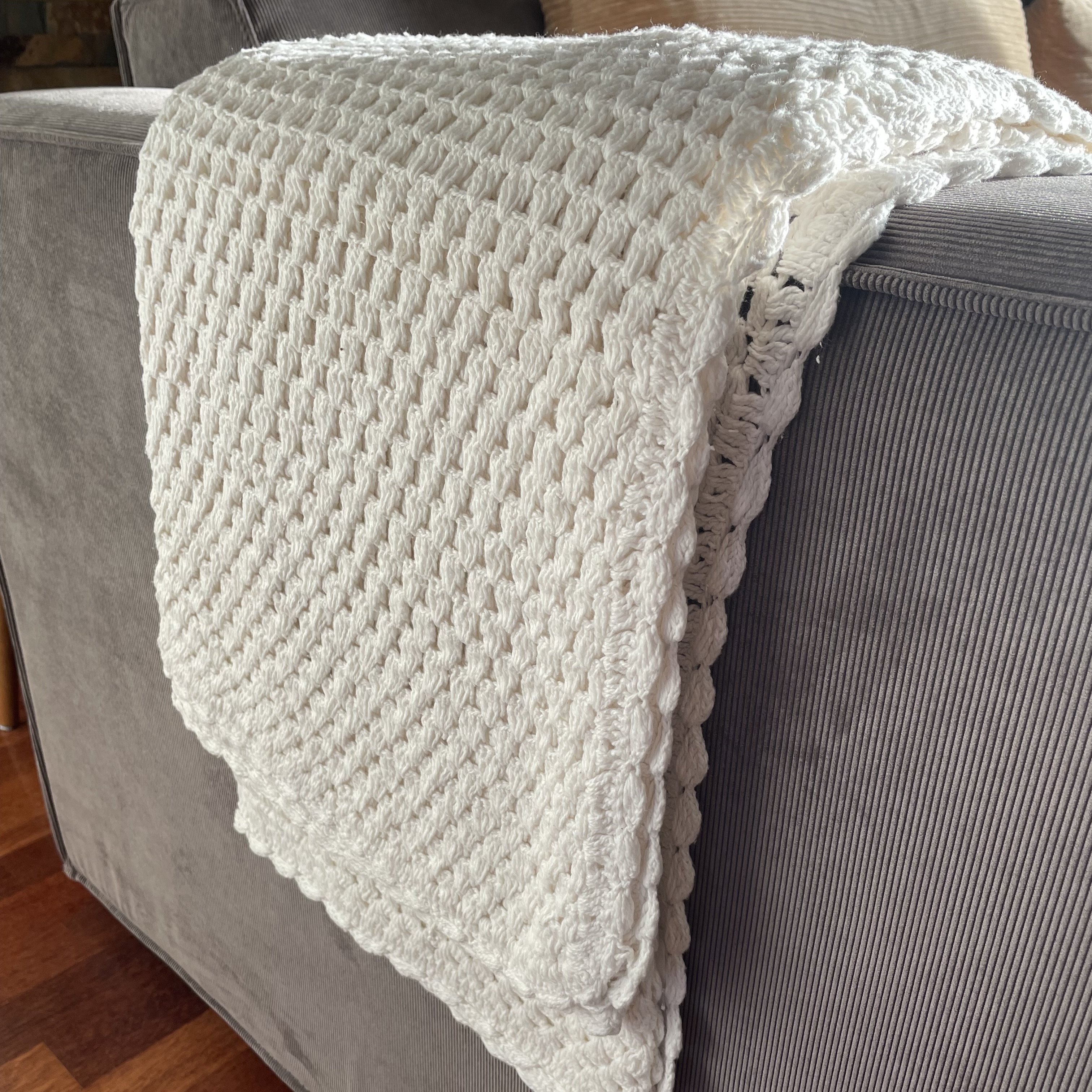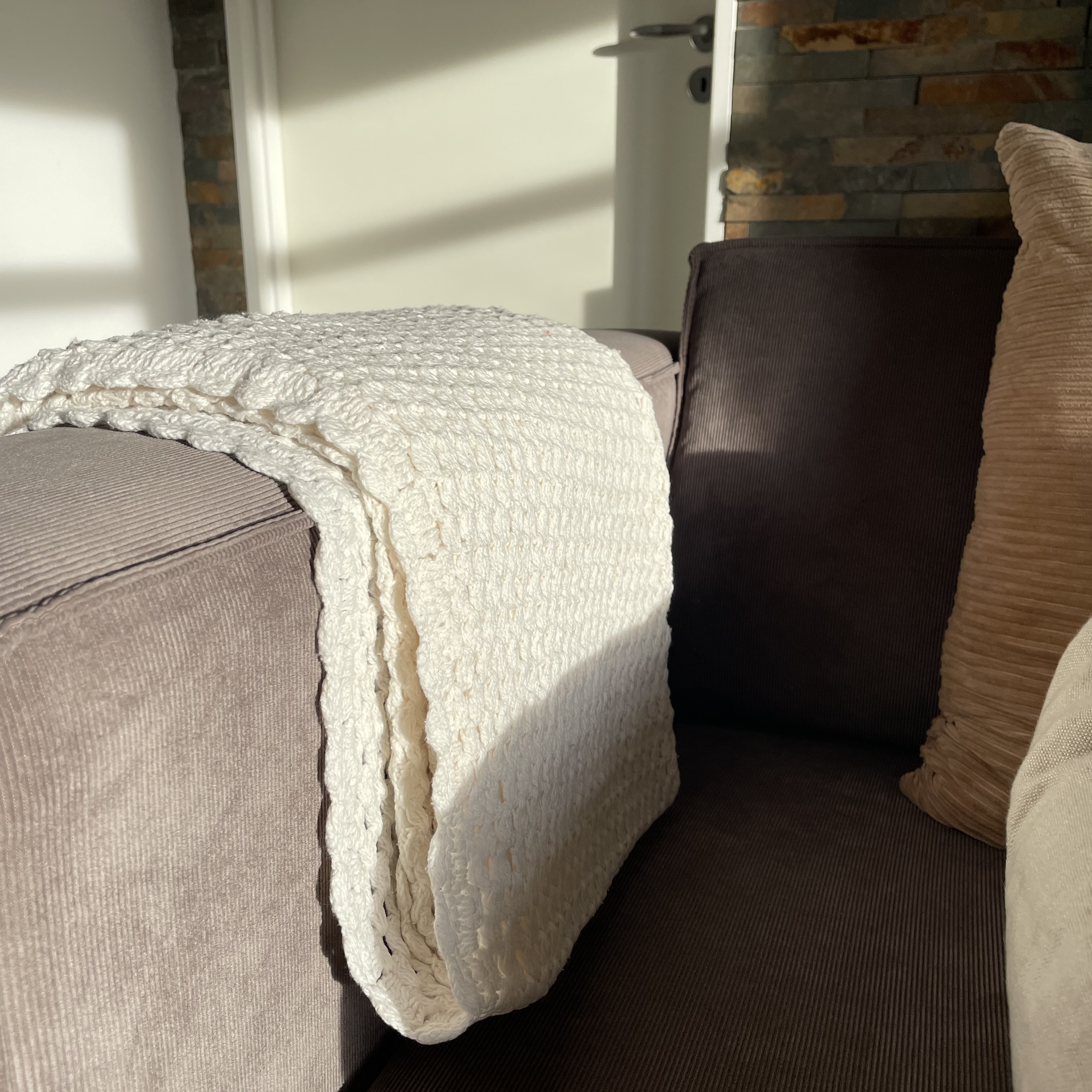 Dette hæklede tæppe i hvid bringer en elegant og tidløs skønhed ind i dit hjem. Ideelt til at skabe en hygge-fyldt atmosfære, kombinerer det blødhed med et smukt håndværk. Perfekt til både stuen og soveværelset.